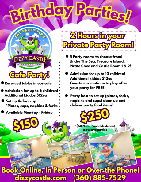* Please remember party items such as birthday cake, presents, decorations etc are only allowed inside Dizzy Castle with a birthday party reservation. *