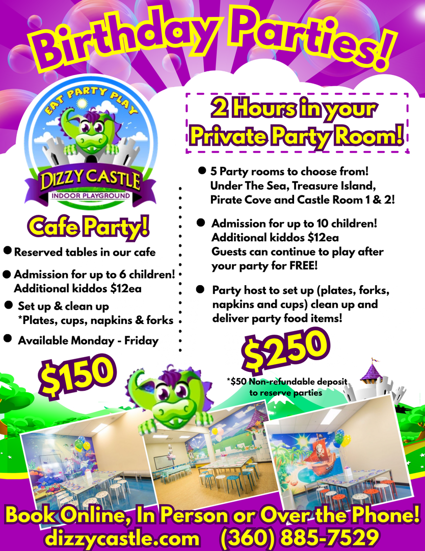 * Your choice of party room! Castle Room 1, Castle Room 2, Treasure Island or Under The Sea!