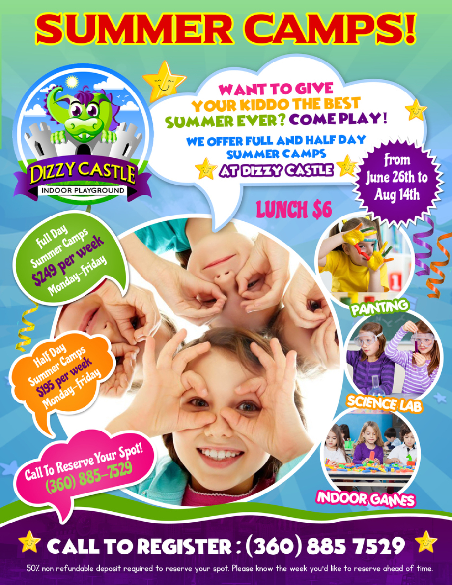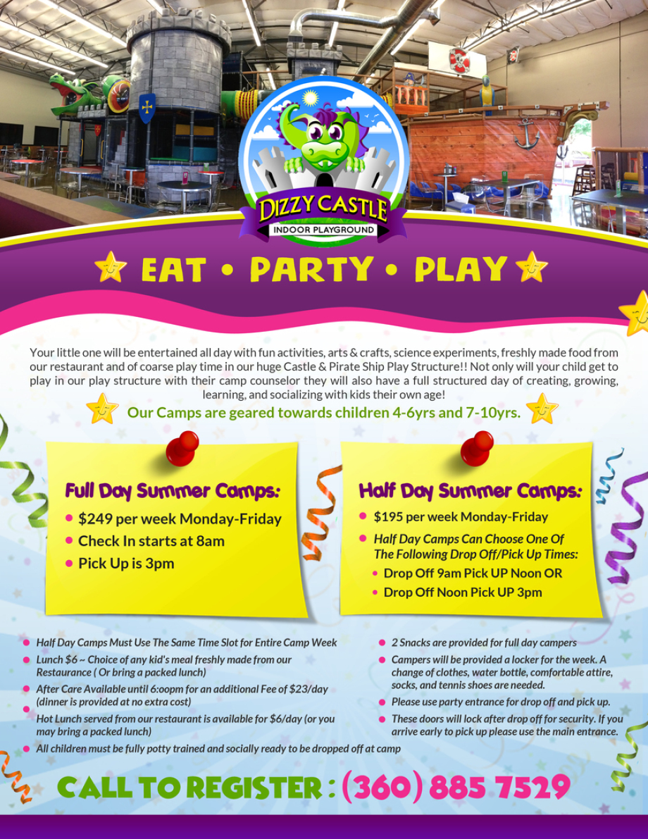 Want to give your kiddo the best summer ever? COME PLAY! We offer full and half day Summer Camps at Dizzy Castle! Your little one will be entertained all day with fun activities, arts & crafts, science experiments, freshly made food from our restaurant and of coarse play time in our huge Castle & Pirate Ship Play Structure!! Not only will your child get to play in our play structure with their camp counselor they will also have a full structured day of creating, growing, learning, and socializing with kids their own age! Our Camps are geared towards children 4-6yrs and 7-10yrs.